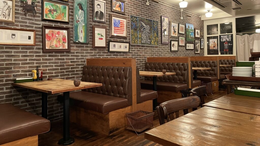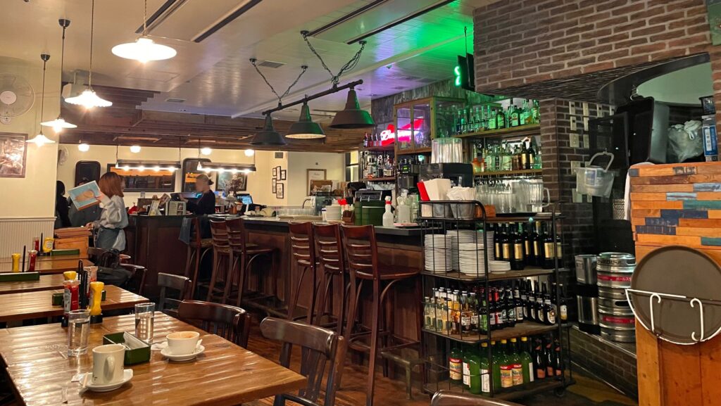 店内はダークウッドとレンガ調の壁の、